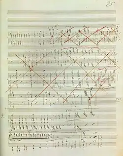 The recapitulation opens with a fugue in B-flat minor,[27] that can also function as a scherzo.[28] Each of the sections are examples of Classical forms, which means that this piece is one of the first instances of Double-function form, a musical piece which has two classical forms happening at the same time; one containing the other. Already in 1851 Liszt experimented with a non-programmatic "four-movements-in-one" form in an extended work for piano solo called Grosses Concert-Solo. This piece, which in 1865 was published as a two-piano version under the title Concerto pathétique, shows a thematic relationship to both the Sonata and the later Faust Symphony.[29] Walker claims the quiet ending of the Sonata was an afterthought; the original manuscript contains a crossed-out ending section which would have ended the work in a loud flourish instead.[7]