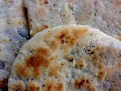 A piaya (Hiligaynon: piyaya, pronounced [piˈjaja]; Spanish: piaya,[2] pronounced [ˈpjaʝa]; Hokkien Chinese: 餅仔; Pe̍h-ōe-jī: piáⁿ-iá) is a muscovado-filled unleavened flatbread from the Philippines especially common in Negros Occidental where it is a popular delicacy.[3] It is made by filling dough with a mixture of muscovado and water. The filled dough is then flattened with a rolling pin, sprinkled with sesame seeds and baked on a griddle.[4] Piaya is best eaten warm.[5]