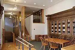 The renovation of 2003-04 was extensive, and included the reconfiguration of student suites, student activities areas, and dining facilities; new bathrooms, new interior finishes and lighting; additional student rooms in a new Upper Court building; complete replacement of all mechanical and electrical systems; new security, fire protection, and information technology systems; new elevators, ramps, and other enhancements to accessibility; and repairs to windows, masonry, roofs, and gutters.[15] The renovation also included enlarging the library and adding a mezzanine level computer cluster.[15] The completion of the additional building, called "Upper Court", increased Pierson College's dorm space capacity from 264 to 310.[15] During the renovation, students who would otherwise live in Pierson College, lived in what is called "Swing Space," dormitories located near Payne Whitney Gymnasium that resemble a cheap hotel and do not include a dining hall.[15]