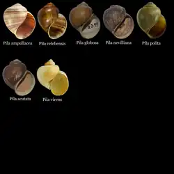 Pila is a genus of large freshwater snails with an operculum, African and Asian apple snails, aquatic gastropod mollusks in the family Ampullariidae, the apple snails.[3]