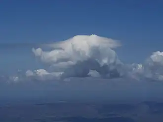 They are formed by strong updraft at lower altitudes, acting upon moist air above, causing the air to cool to its dew point as it rises.[3][4] As such, they are usually indicators of severe weather, and a pileus found atop a cumulus cloud often foreshadows transformation into a cumulonimbus cloud, as it indicates a strong updraft within the cloud.[3]