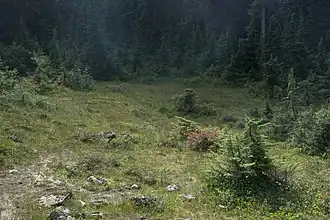 Many fungi and plant species live in this coniferous forest. Community members have used iNaturalist to record sightings of fungi such as hair ice (found to form when Exidiopsis effusa is present), the common bonnet and the turkey-tail.[17] Plant species include licorices and western sword ferns, vine maple, bearberry, swamp currant and bog Labrador tea.[17] Plants like the bog Labrador are able to grow because of Widgeon Valley's nationally-recognized wetlands.[10] Within the park there are diverse tree species that can be found all over British Columbia. Trees such as the western hemlock, Douglas fir, bigleaf maple and red alder are some of the main species that grow in the park.[18]