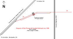 The P&F began operations in November 1934 using abandoned Toledo and Western Railroad trackage between Pioneer and Fayette, Ohio.[1] The P&F connected with the Wabash at Franklin Junction near Alvordton, Ohio.