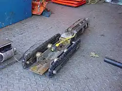 At the back end of the truck is a powered reel with video cable reinforced with kevlar or steel wire braid. Some trucks also contain a powered winch that booms out from the truck allowing for lowering and retrieval of the inspection equipment from the pipeline.