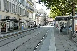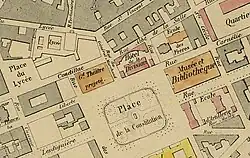 This square, surrounded by monumental buildings dating, for the most part, from the end of the 19th century, forms a square of 150 meters on each side, sheltering a square with a basin equipped with a water jet in its center. The place also houses an underground car park, the entrance to which is located on the north side.[2] The tram line runs along this square between rue Général Marchand (to the north) and rue Fantin-Latour (to the south).
