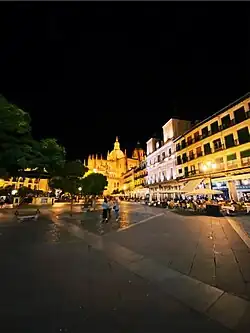 Centuries before the plaza was built in the 17th century, the space was treated as the center of the village, where vendors would install their stands and citizens would socialize and meet. It is said that in the middle ages, the street was known as Calle de la Cinteria, which means Ribbon Street because of the sector's shops and all its vendors.[1] The town hall was built in the 17th century and ever since has been the building where the majority of Segovian events take place. Then towards the left of the town hall, there is the Cathedral known as Santa Maria de la Asuncion and San Frutos that was built between 1525 and 1577. The Church of San Miguel collapsed in the year 1532 but was then rebuilt in the same current place.[2]