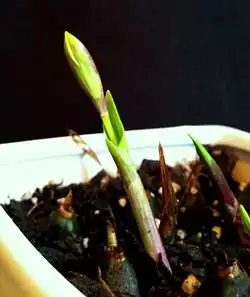 The sympodial growth habit of terrestrial Pleione orchids is unusual. They have relatively large, spongy, almost globular or ampulliform pseudobulbs, narrowed at the apex. Every pseudobulb is only active for one year and carries one or two pleated parallel-veined leaves, with a length of 15–30 cm (6–12 in). These drop off before winter. The pseudobulb stays dormant, till a new one starts to develop. This one produces new roots and a short pedicel. This pseudobulb remains active till the end of the bloom. Then the whole cycle starts all over again.