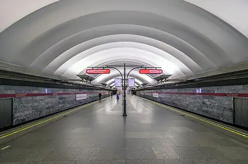 Ploshchad Muzhestva (Russian: Пло́щадь Му́жества, Square of Fortitude) is a station of the Saint Petersburg Metro. Opened on 31 December 1975. The station got its name because of its location next to the eponymous Muzhestva Square (roundabout). The square and the station were designed as a starting point on the way to Piskaryovskoye Memorial Cemetery where hundreds of thousands of victims, mostly civilian, of the 1941-44 siege of the city during World War II are buried.