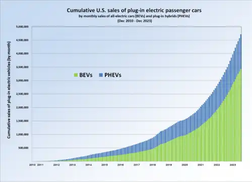 - ^ Argonne National Laboratory (28 September 2020). "Fact #1153 Dataset: Cumulative Plug-In Vehicle Sales in the United States Reach 1.6 Million Units". Vehicle Technologies Office, EERE, US Department of Energy. Retrieved 6 October 2020. Click the link to open the Excel file "fotw_1153_web (version 1)" with detailed sales by month from December 2010 through August 2020.