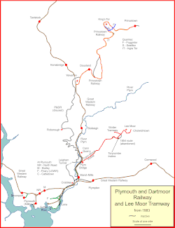 - ^ Authorities are imprecise about the extent of the first opening. The most thorough works are probably Kendall, and also Shepherd, who on page 51 simply refers to "Opening Day" without indicating the extent. On the same page he says that "the extensions at each end of the line—to Sutton Pool in the south and to Princetown in the north—were completed in December 1825 and December 1826 respectively". However his map of the line on page 9 shows "original terminus of the line" at Crabtree. Dart, in "Devon Narrow Gauge" says on the page following plate 21, that "In 1825 the line was extended to Sutton Harbour, with a branch to Laira (Martin's) Wharf. The section from the quarries to Princetown opened in 1826." (Laira is on the Cattewater, a location also referred to.)