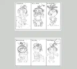 Klak is a cheerful, and unlucky pygmy, the most major difference to him in the comics and in the game is that in the comic he is chubby, and constantly searches for food. The bone in his hair is significantly smaller than the others, comically showing that he is more afraid of dangers than anyone else. Klak usually backs up Booga's remarks, usually standing beside him while doing so. Like all of the tribe, except Nooby, he thinks that Ooga is a monster, but he does not dislike him like most of the tribe. Other than Nooby, he is killed more than any other pygmy in the tribe. He is almost always killed unusually, e.g.. He eats a fish that is too hot and sprints to the water and throws his head in to cool down. Then, a shark with what looks like a military nitrogen laser slowly lurks towards him, almost like Jaws, but before the shark gets its chance, Klak is caught by a giant octopus and is eaten alive.
