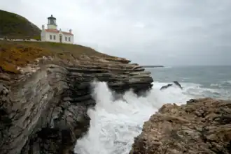 Point Conception (Chumash: Humqaq; Spanish: Punta Concepción) is a headland along the Gaviota Coast in southwestern Santa Barbara County, California, United States. It is the point where the Santa Barbara Channel meets the Pacific Ocean, and as the corner between the mostly north-south trending portion of coast to the north and the east-west trending part of the coast near Santa Barbara, it makes a natural division between Southern and Central California,[1] and is commonly used as such in regional weather forecasts.[2] Point Conception Light is at its tip and the Jack and Laura Dangermond Preserve covers some of the surrounding land.