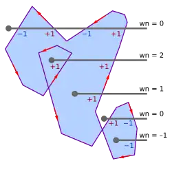 An improved algorithm to calculate the winding number was developed by Dan Sunday in 2001.[6] It does not use angles in calculations, nor any trigonometry, and functions exactly the same as the ray casting algorithms described above. Sunday's algorithm works by considering an infinite horizontal ray cast from the point being checked. Whenever that ray crosses an edge of the polygon, Juan Pineda's edge crossing algorithm (1988)[7] is used to determine how the crossing will affect the winding number. As Sunday describes it, if the edge crosses the ray going "upwards", the winding number is incremented; if it crosses the ray "downwards", the number is decremented. Sunday's algorithm gives the correct answer for nonsimple polygons, whereas the boundary crossing algorithm fails in this case.[6]