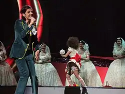 Laka took part in technical rehearsals on 12 and 15 May, followed by dress rehearsals on 19 and 20 May. The Bosnian-Herzegovinian performance featured Laka in a white and yellow striped t-shirt and a blue-green suit, joined on stage by his sister Mirela Laković in a white dress with apples on and four backing vocalists in wedding gowns.[19] The performance began with Mirela hanging clothes on a washing line and collecting bouquets from the backing vocalists, all of them which then knitted. At the end of the performance, the word "LOVE" was displayed on the clothes. The stage lighting and LED screens displayed various colours.[20][21]