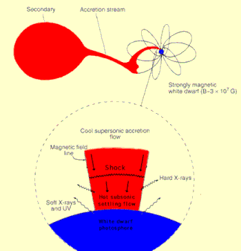 One of the most critical consequences of the WD's magnetism is that it synchronizes the rotational period of the WD with the orbital period of the binary;[2] to first order, this means that the same side of the WD always faces the donor star. This synchronous rotation is considered a defining feature of polars.[1][2] Additionally, the WD's magnetic field captures the accretion stream from the donor star before it can develop into an accretion disk. The capture of the accretion stream is known as threading, and it occurs when the magnetic pressure from the WD matches the stream's ram pressure.[2] The captured material flows along the WD's magnetic field lines until it violently accretes onto the WD in a shock near one or more of the star's magnetic poles.[2] This accretion region covers only a fraction of the WD's surface, but it can contribute half of the system's optical light.[4] In addition to optical and near-infrared cyclotron radiation, the accretion region also produces X-rays due to the high temperature of gas within the shock, so polars are frequently brighter in X-rays than non-magnetic CVs.[1]