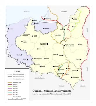 The Border Agreement between Poland and the USSR of 16 August 1945 established the borders between the Soviet Union (USSR) and the People's Republic of Poland. It was signed by the Provisional Government of National Unity (Tymczasowy Rząd Jedności Narodowej) formed by the Polish communists. According to the treaty, Poland officially accepted the ceding its pre-war Eastern territory to the USSR (Kresy) which was decided earlier in Yalta already. Some of the territory along the Curzon line, established by Stalin during the course of the war, was returned to Poland. The treaty also recognised the division of the former German East Prussia and ultimately approved the finalised delimitation line between the Soviet Union and Poland: from the Baltic Sea, to the border tripoint with Czechoslovakia in the Carpathians.[1][2][3] The agreement entered into force on 5 February 1946.[4]