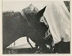 Poll evil is a traditional term for a painful condition in a horse or other equid, that starts as an inflamed bursa at the cranial end of the neck between vertebrae and the nuchal ligament, and swells until it presents as an acute swelling at the poll, on the top of the back of the animal's head. The swelling can increase until it ruptures and drains.[1] It can be caused by infection from Actinomyces bovis or Brucella abortus organisms, but may also occur due to parasite infestation, skin trauma, or badly fitting horse tack.[2] Because of modern efforts to reduce the incidence of brucellosis in livestock, horses are less exposed to the Brucella abortus organism, and hence most modern cases of poll evil arise from trauma linked to a horse striking its head against poorly designed or low-clearance structures, or to improper use of equipment, particularly leaving a halter on the horse around the clock.[1]