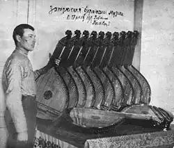 New Kharkiv banduras made by H. Paliyivetz for the Poltava Capella in 1931 specially for the North American tour. Note the retuning and dampening mechanisms.