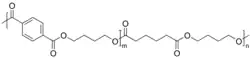 PBAT (short for polybutylene adipate terephthalate) is a biodegradable random copolymer, specifically a copolyester of adipic acid, 1,4-butanediol and terephthalic acid. PBAT is produced by many different manufacturers and may be known by the brand names ecoflex, Wango, Ecoworld, Eastar Bio, and Origo-Bi. It is also called poly(butylene adipate-co-terephthalate) and sometimes polybutyrate-adipate-terephthalate[1] (a misnomer) or even just "polybutyrate".[2] It is generally marketed as a fully biodegradable alternative to low-density polyethylene, having many similar properties including flexibility and resilience, allowing it to be used for many similar uses such as plastic bags and wraps.[3] The structure is a random-block polymer consisting of butanediol–adipic acid and butanediol-terephthalic acid blocks.