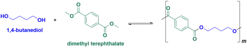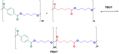Adipic acid and 1,4-butanediol are polymerized to create their polyester (plus water). DMT and 1,4-butanediol are also reacted to form their polyester (plus methanol). This polyester is then added to the butylene adipic acid polyester by using tetrabutoxytitanium (TBOT) as a transesterification catalyst; an overabundance of 1,4-butanediol influences chain lengths. The result is a copolymer of the two previously prepared polymers.