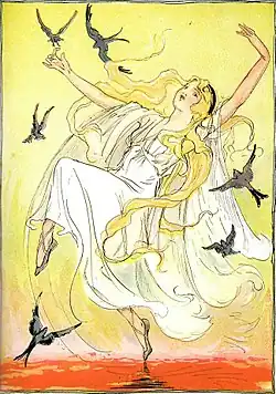 Polychrome is a cloud fairy and the youngest daughter of the Rainbow, thus she is a "sky princess". She first appears in The Road to Oz (1909), which is the fifth book of the original fourteen Oz books by American author by L. Frank Baum.[1] She also appears several times in later Oz stories of the classic series and in literature written by authors other than Baum.