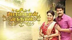 Ponmagal Vanthal (transl. Goddess of Wealth Appeared) is a Tamil-language family soap opera series starring Meghna Vincent, Vicky Krish, Shanoor Sana and Vandana Michael. It began airing on 26 February 2018 and ended on 1 February 2020 for 571 episodes on Vijay TV,[1] every Monday to Friday in an afternoon programming block called "Vijay Matinee Thodargal". Later the show was rescheduled to air Monday through Saturday.[2][3] The series marks the debut Tamil-language television series for Ayesha of Kerala, who plays the lead role; however she was replaced by Meghna Vincent after episode 105.[4] The series is directed by Gopal Shamugam.