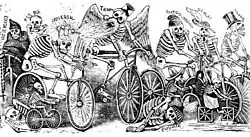 Bicycles were imported from Paris and Boston to Mexico City in 1869, just after the French Intervention. A French company imported bicycles and set up a rental business, but the sport took off when the technology improved in the 1890s with wheels of equal size and pneumatic tires. Bicycle clubs and organized races made their appearance soon after. Organized sports with rules, equality of competition, bureaucracy and formal record keeping became hallmarks of modernity. Although men dominated the sport, women also participated. For women especially, bicycling challenged traditional behavior, demeanor, and fashions, freeing them from being closely supervised shut-ins. Riding a bicycle required better women's clothing, and many adopted Bloomers for riding. In 1898, cartoon montage in the satirical publication El Hijo del Ahuizote answered the question "why go by bicycle?": for amusement, for pleasure in the streets, and one panel shows a bicycle on its side with a couple embracing, with the caption "for love." Cycling was touted as promoting exercise and good hygiene and was associated with modernity, speed, and modernization through technology.[47]