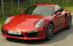 Introduced in May 2013, the 991 Turbo has a twin-turbocharged 3.8-litre flat-6 engine generating 520 PS (382 kW; 513 hp) and 620 N⋅m (457 lb⋅ft) of torque.[25] The S version has an upgraded version of the engine generating a maximum power output of 560 PS (412 kW; 552 hp) and 700 N⋅m (516 lb⋅ft) of torque, but the torque is pushed to 750 N⋅m (553 lb⋅ft) with overboost function. Both of the versions have all-wheel drive. The Turbo and Turbo S was available exclusively with 7-speed PDK. The Turbo S can reach 100 km/h (62 mph) in 2.9 seconds as claimed by Porsche but has achieved 2.6 seconds by many car magazine tests.[26][27] New technologies featuring adaptive aerodynamics and rear wheel steering are included as standard.