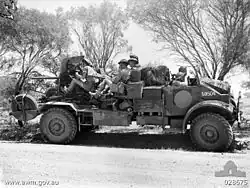 An Ordnance QF 6 pounder (57 mm) anti-tank gun mounted on a Bedford QLT 3-ton lorry or Austin K5 3 ton lorry. Both vehicles had a special frame-only body carrying the gun, crew, ammunition and the rarely used side shields. A F60 or C60 with cut down number 13 cab was similarly used.[7] The size and weight of the new gun led to it being dismounted before going into action more often than the smaller 2-pounder.[8]