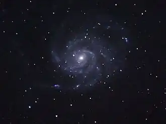 The Pinwheel Galaxy, or M101, was discovered by Pierre Méchain, on March 27, 1781, and is located between 23,790,000 or 27,000,000 light years from Earth. It is the brightest galaxy in the M101 group of galaxies, with an apparent magnitude of +7.9 and an absolute magnitude of -21.6. The Pinwheel galaxy can be found in the Ursa Major constellation, and the M101 group of galaxies. This picture was taken and released by an amateur astronomer.