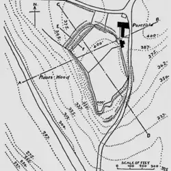 Planes Wood is an area of woodland on the steep slope to the west. Since at least the 16th century, the name Portfield has been attached to a farm at the northeast edge of the site. The English word 'port'[4] may have been borrowed from the Latin portus, a possible meaning of which is haven or refuge.[5][2]