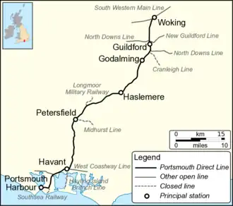 The Portsmouth Direct line is a railway route between Woking in Surrey and Portsmouth Harbour in Hampshire, England. It forms the principal route for passenger trains between London, Guildford and Portsmouth; connections are made to the ferry services which operate between Portsmouth and the Isle of Wight. The final section of line from Havant to Portsmouth is shared with other passenger routes.