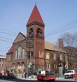 The Portuguese Seventh-day Adventist congregation was located on College St. just west of Bathurst St from 1970 to 2007. The former location was originally built as College Street Baptist Church in 1889. In 1970 the church was sold to the Portuguese Seventh-day Adventist congregation, the area having become the centre of Toronto's Portuguese community. In 2007, the building was sold to developer Matthew Kosoy who turned this College Street landmark into four large multi-level luxury freehold homes.[1] The church building was restored to its Romanesque Revival style.[2] In January 2013, the congregation relocated to 280 Carlingview Dr, Toronto, Toronto, ON M9W 5G1.