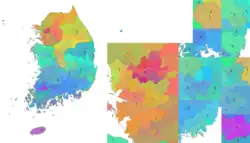 - ^ Sejong-si is a one-level municipality, although it is considered as a high-level. There is no low-level municipality in it.
