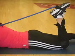 Another important aspect of maintaining an injury free knee is having strong quadriceps and hamstring muscles because they help stabilize the knee. A low hamstring to quadriceps ratio is associated with knee injury and should be about eighty percent.[19] Some exercises to strengthen the quadriceps and hamstring muscles include leg curls, leg lifts, prone knee flexion with resistance band and knee extensions. Some stretches to help prevent injury to the posterior cruciate ligament include stretching of the hamstring muscles by extending the legs, toes pointing up, leaning forward until the stretch is felt and holding for a few seconds.