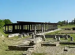 Excavations as well as geophysical survey have located several public buildings around the forum square: a possible basilica, a main temple, a possible curia and a food market (macellum). A small theatre lies near the eastern city wall and a possible baths building in the south. The geophysical surveys helped also to distinguish remains and partial plans of many housing units, some of domus type, others clearly tabernae, and others simple habitations and shops, spread all over the many insulae.