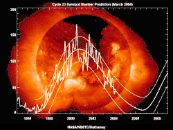 NASA's 2004 predictions of the solar cycle, which were inaccurate (predicting that solar cycle 24 would start in 2007 and be larger than cycle 23), and the refined predictions in 2012, showing it started in 2010 and is very small