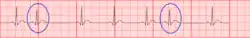 A premature atrial contraction (PAC), also known as atrial premature complex (APC) or atrial premature beat (APB), is a common arrhythmia characterized by premature heartbeats originating in the atria. While the sinoatrial node typically regulates the heartbeat during normal sinus rhythm, PACs occur when another region of the atria depolarizes before the sinoatrial node and thus triggers a premature heartbeat,[1] in contrast to escape beats, in which the normal sinoatrial node fails, leaving a non-nodal pacemaker to initiate a late beat.