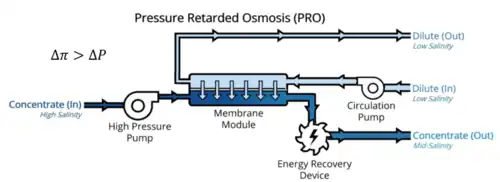 PRO uses a water–permeable membrane with an osmotic pressure difference to drive water flux from a low–concentration "diluate" stream, into a slightly pressurized higher–concentration. An energy recovery device on this stream provides the energy output, and must exceed the pumping pressure input for net power production.