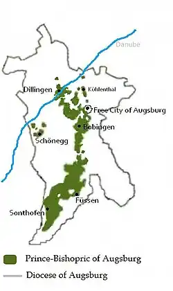 The Prince-Bishopric of Augsburg (German: Fürstbistum Augsburg; Hochstift Augsburg) was one of the Prince-bishoprics of the Holy Roman Empire, and belonged to the Swabian Circle. It should not be confused with the larger diocese of Augsburg, over which the prince-bishop exercised only spiritual authority.