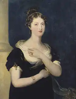 As Charlotte entered her teenage years, members of the Court considered her behaviour undignified.[26] Lady de Clifford complained about Charlotte's allowing her ankle-length underdrawers to show.[27] Lady Charlotte Bury, a lady-in-waiting to Caroline and a diarist whose writings have survived, described Princess Charlotte as a "fine piece of flesh and blood" who had a candid manner and rarely chose to "put on dignity".[28] Her father was proud of her horsemanship.[27] She was fond of music by Mozart and Haydn, and she identified with the character of Marianne in Sense and Sensibility.[21] In 1808 Charlotte Jones was appointed as Charlotte's own official miniature portrait painter.
