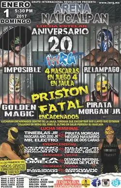 In late 1995 Adolfo Moreno decided to create his own promotion, using a regular core roster supplemented with wrestlers from Consejo Mundial de Lucha Libre (CMLL, formerly EMLL), creating the International Wrestling Revolution Group (IWRG; sometimes referred to as Grupo Internacional Revolución in Spanish) on January 1, 1996.[3] From that point on Arena Naucalpan became the main venue for IWRG, hosting the majority of their weekly shows and all of their major shows as well.[4][5] The first IWRG Anniversary Show was held on January 1, 1997 with all subsequent shows being held on or right after January 1 each year, all at Arena Naucalpan.[4] Posters for the January 1 show mistakenly lists it as the 20th anniversary show, but also bills it as a Prisión Fatal ("Deadly Prison") show.
