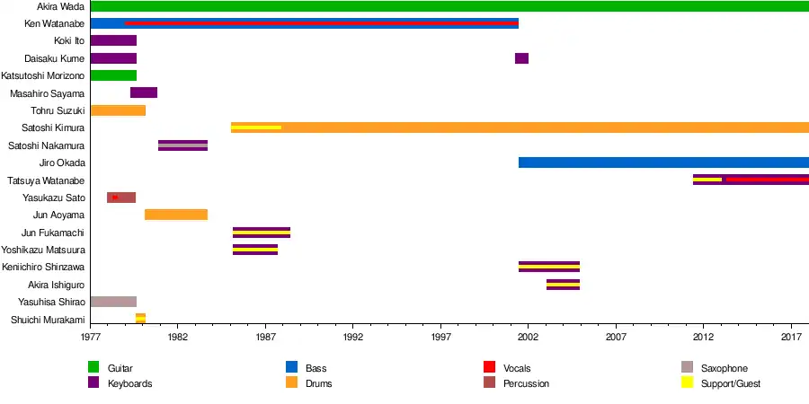 The band's final line-up was composed of Jiro Okada (bass), Satoshi "Mansaku" Kimura (drums), Akira Wada (guitar) and Tatsuya "Cheru" Watanabe (keyboards, vocals) as of their suspension of activities in 2018.[3] On March 28, 2021, Wada died at the age of 64.[4]