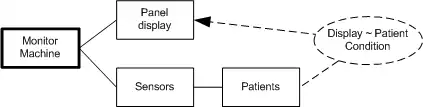 The name of the requirement is "Display ~ Patient Condition". The tilde (~) indicates that the requirement is about a relationship or correspondence between the panel display and patient conditions. The arrowhead indicates that the requirement reference connected to the Panel Display domain is also a requirement constraint. That means that the requirement contains some kind of stipulation that the Panel display must meet. In short, the requirement is that The panel display must display information that matches and accurately reports the condition of the patients.