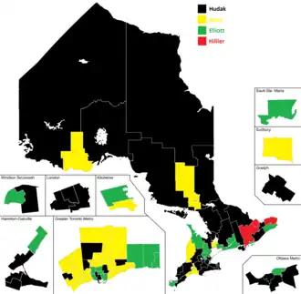 Winning candidate in each riding (first ballot). Dark blue=Hudak, Light Blue=Klees, Green=Elliott, Red=Hillier, Grey=Tie.[23]