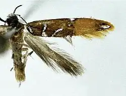 The wingspan is about 11 mm. The basal three-fifths of the forewings are ochreous brown and the distal two-fifths are ochreous yellow. The markings are silvery white or white, edged with dense black scales. The hindwings and cilia are dark grey.[1]