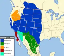 Other regional subspecies include the Rocky Mountain pronghorn (A. a. americana), Mexican pronghorn (A. a. mexicana), the Oregon pronghorn (A. a. oregona), and the critically endangered Baja California pronghorn (A. a. peninsularis).