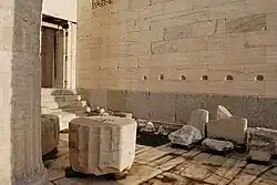 The building features no decorative or architectural sculpture; all metopes and pediments were left empty and there were no akroteria.[31] Nonetheless, a number of freestanding shrines and votives stood in the vicinity of the Propylaea, and have come to be associated with it if only by virtue of Pausanias' description of them and their proximity to the building. In the western precinct, there was the Hermes Propylaios by Alkamenes, which stood on the north end of the entrance.[32] Similarly, a relief of the Graces, made by Sokrates (the Boeotian sculptor active around 450 BC), stood on the south of the entrance. In the east precinct, the bronze statue of Diotrephes, an Athenian general killed in combat in Boeotia during the Peloponnesian War, stood behind the second column from the south. The statue of Aphrodite made by Kalamis and dedicated by Kallias stood behind the second column from the north. The Leaina (an Archaic bronze lioness) stood near the north wall. A votive column carrying a young rooster probably stood along the south wall. A small shrine dedicated to Athena Hygieia was erected against the southernmost column on the eastern facade soon after 430 BC.[33] Though accounts differ, this last shrine might have been erected to thank Athena for the end of the great plague.[34]