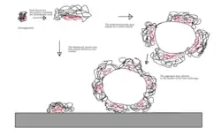 A biofilm is a community of microorganisms adsorbed to a surface. Microorganisms in biofilms are enclosed in a polymeric matrix consisting of exopolysaccharides, extracellular DNA and proteins. Seconds after a surface (usually metal) is placed in a solution, inorganic and organic molecules adsorb onto the surface. These molecules are attracted mainly by Coulombic forces (see above section), and can adhere very strongly to the surface. This first layer is called the conditioning layer, and is necessary for the microorganisms to bind to the surface. These microorganisms then attach reversibly by Van der Waals forces, followed by irreversible adhesion through self-produced attachment structures such as pili or flagella.[7] Biofilms form on solid substrates such as stainless steel. A biofilm's enclosing polymeric matrix offers protection to its microbes, increasing their resistance to detergents and cleaning agents. Biofilms on food processing surfaces can be a biological hazard to food safety. Increased chemical resistance in biofilms can lead to a persistent contamination condition.[8]