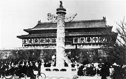 Signs on Tiananmen Gate hailing the founding of the government in 1937